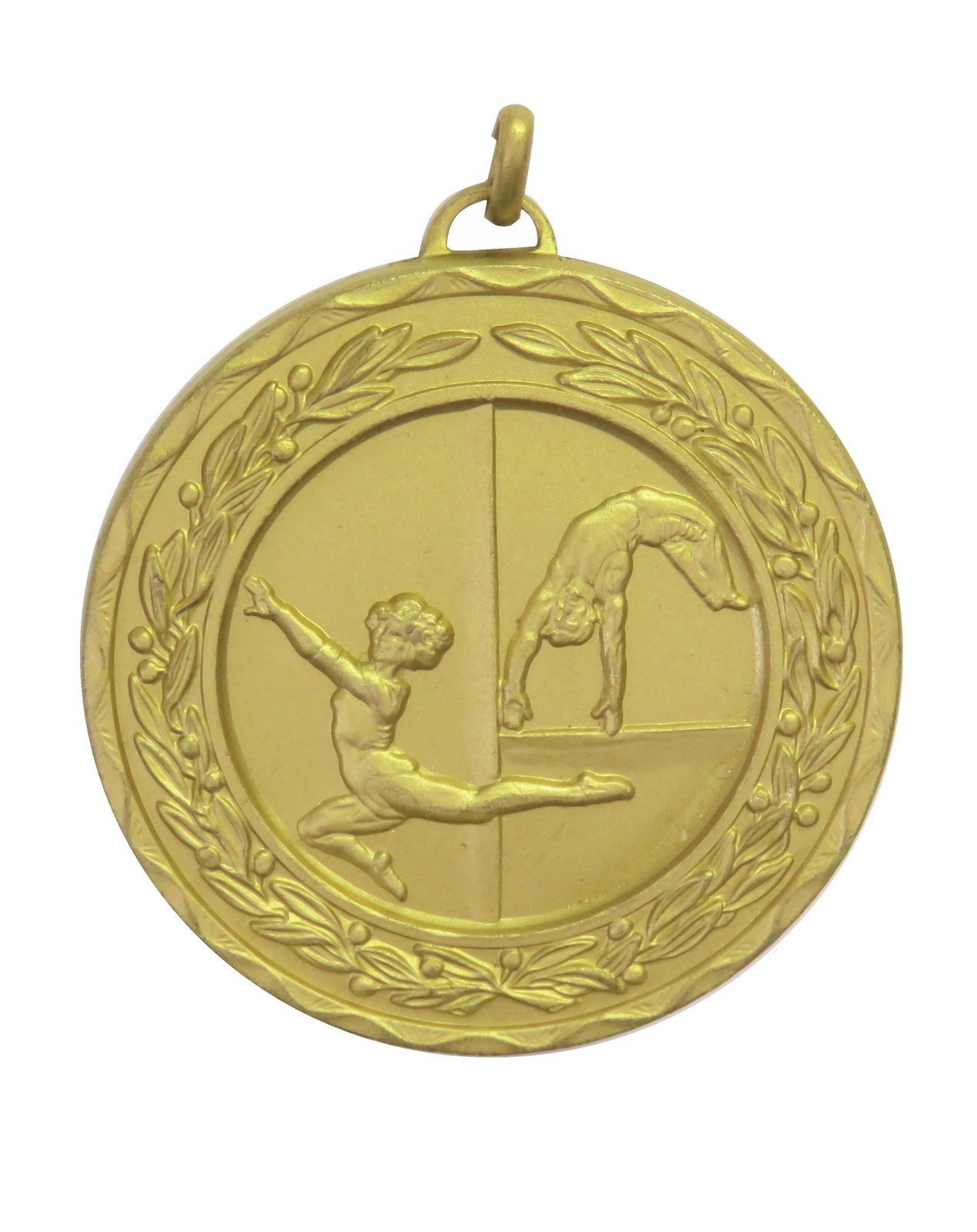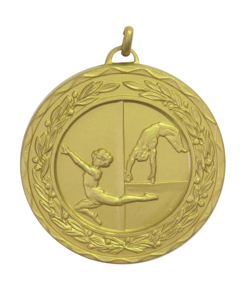 A high quality embossed gold metal gymnastics medal displaying floor moves within a laurel design. The diameter is 50mm and the thickness is 3mm making for a heavy feel. This medal can be engraved on the reverse and comes complete with a loop to accomadate a ribbon.