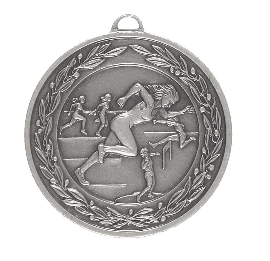 A high quality embossed silver metal female track and field medal displaying the athletes in action within a laurel design. The diameter is 50mm and the thickness is 3mm giving the medal a heavy feel. This medal can be engraved on the reverse and comes complete with a loop to accommodate a ribbon.