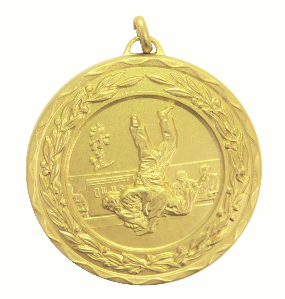 A high quality embossed gold metal judo medal displaying two fighters in competition within a laurel design. The diameter is 50mm and the thickness is 3mm giving the medal a heavy feel. This medal can be engraved on the reverse and comes complete with a loop to accomadate a ribbon.