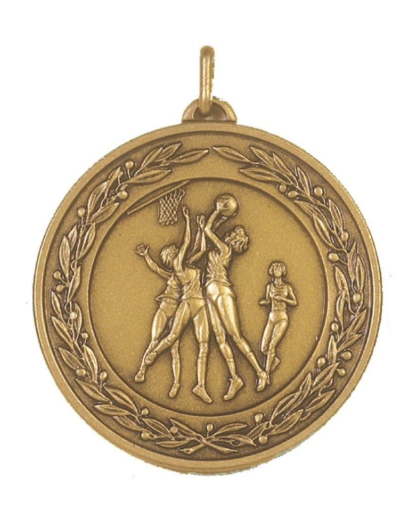A high quality embossed bronze metal basketball medal displaying players in action within a laurel design. The diameter is 50mm and the thickness is 3mm making for a heavy feel. This medal can be engraved on the reverse and comes complete with a loop to accomadate a ribbon.