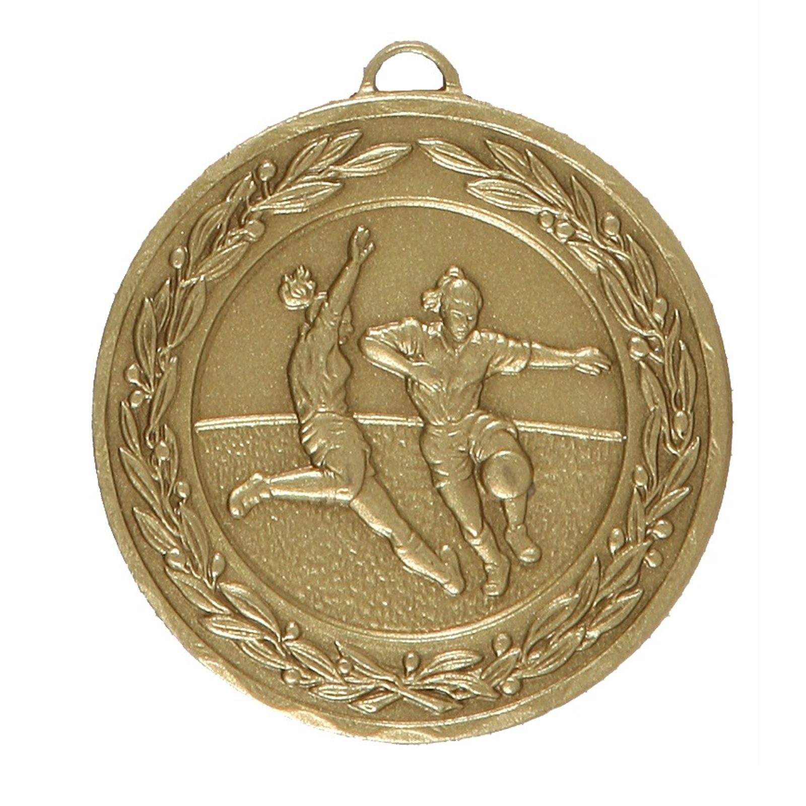 A high quality embossed bronze metal football medal displaying two players in the tackle action within a laurel design. The diameter is 50mm and the thickness is 3mm giving the medal a heavy feel. This medal can be engraved on the reverse and comes complete with a loop to accommodate a ribbon.