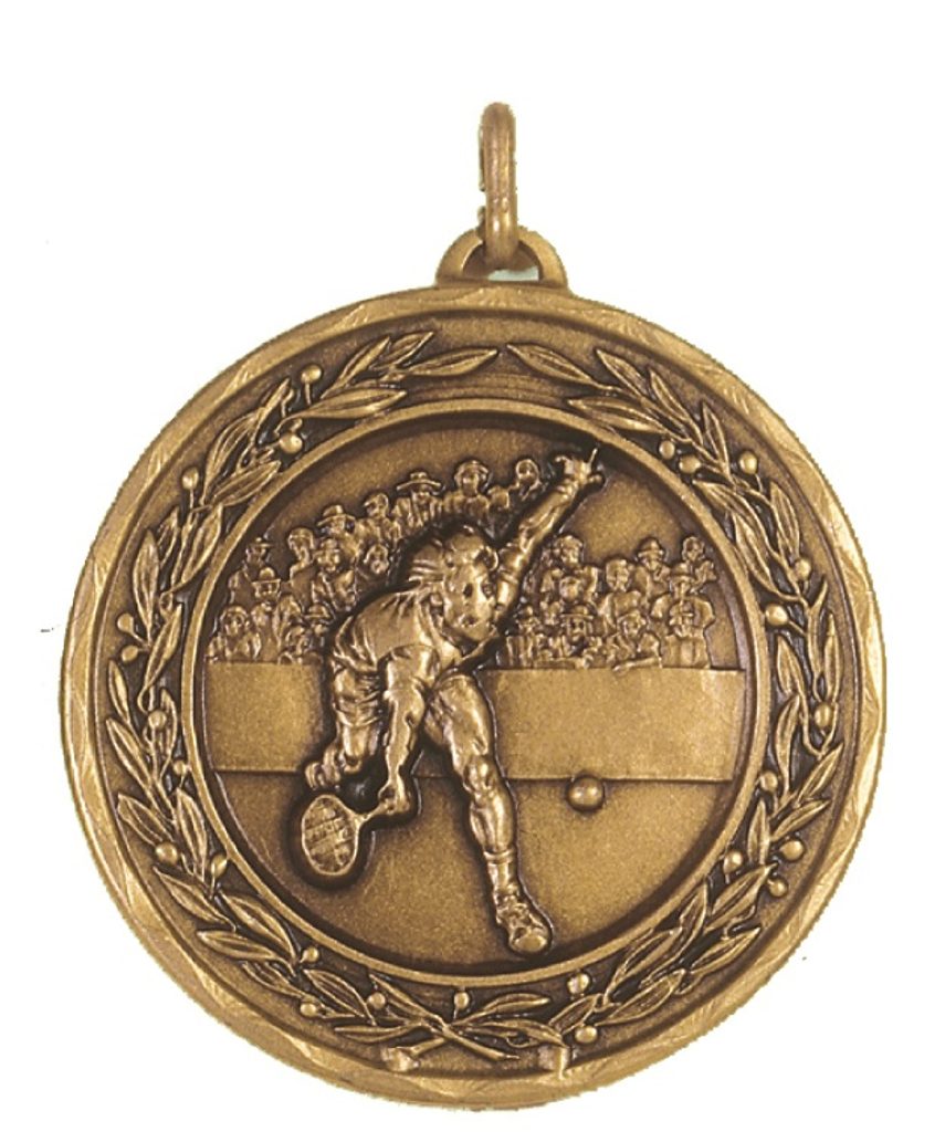 A high quality embossed bronze metal tennis medal displaying a single male player in action within a laurel design. The diameter is 50mm and the thickness is 3mm giving the medal a heavy feel. This medal can be engraved on the reverse and comes complete with a loop to accomadate a ribbon.