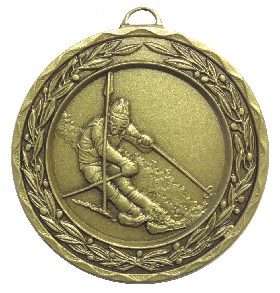 A high quality embossed bronze metal skiing medal displaying a skier in slalom action within a laurel design. The diameter is 50mm and the thickness is 3mm giving the medal a heavy feel. This medal can be engraved on the reverse and comes complete with a loop to accomadate a ribbon.