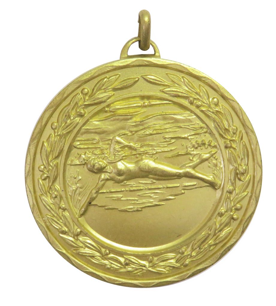 A high quality embossed gold metal swimming medal displaying a female swimmer in action performing the front crawl stroke within a laurel design. The diameter is 50mm and the thickness is 3mm giving the medal a heavy feel. This medal can be engraved on the reverse and comes complete with a loop to accomadate a ribbon.