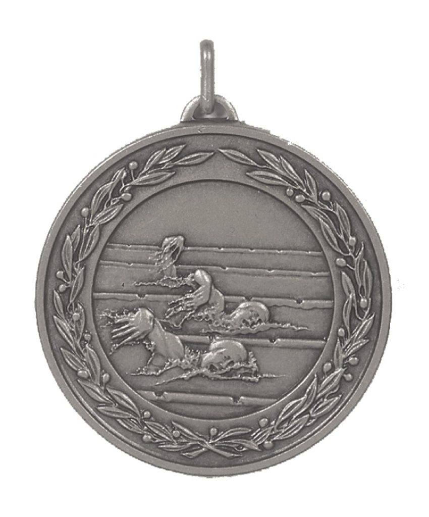 A high quality embossed silver metal swimming medal displaying a female swimmer in action performing the front crawl stroke within a laurel design. The diameter is 50mm and the thickness is 3mm giving the medal a heavy feel. This medal can be engraved on the reverse and comes complete with a loop to accomadate a ribbon.