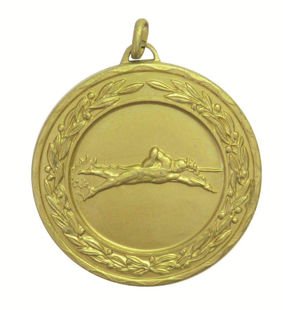 A high quality embossed gold metal swimming medal displaying a male swimmer in action performing the front crawl stroke within a laurel design. The diameter is 50mm and the thickness is 3mm giving the medal a heavy feel. This medal can be engraved on the reverse and comes complete with a loop to accomadate a ribbon.