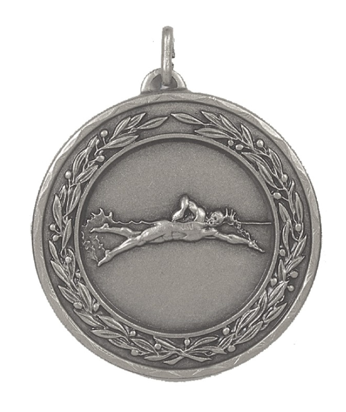 A high quality embossed silver metal swimming medal displaying a male swimmer in action performing the front crawl stroke within a laurel design. The diameter is 50mm and the thickness is 3mm giving the medal a heavy feel. This medal can be engraved on the reverse and comes complete with a loop to accomadate a ribbon.