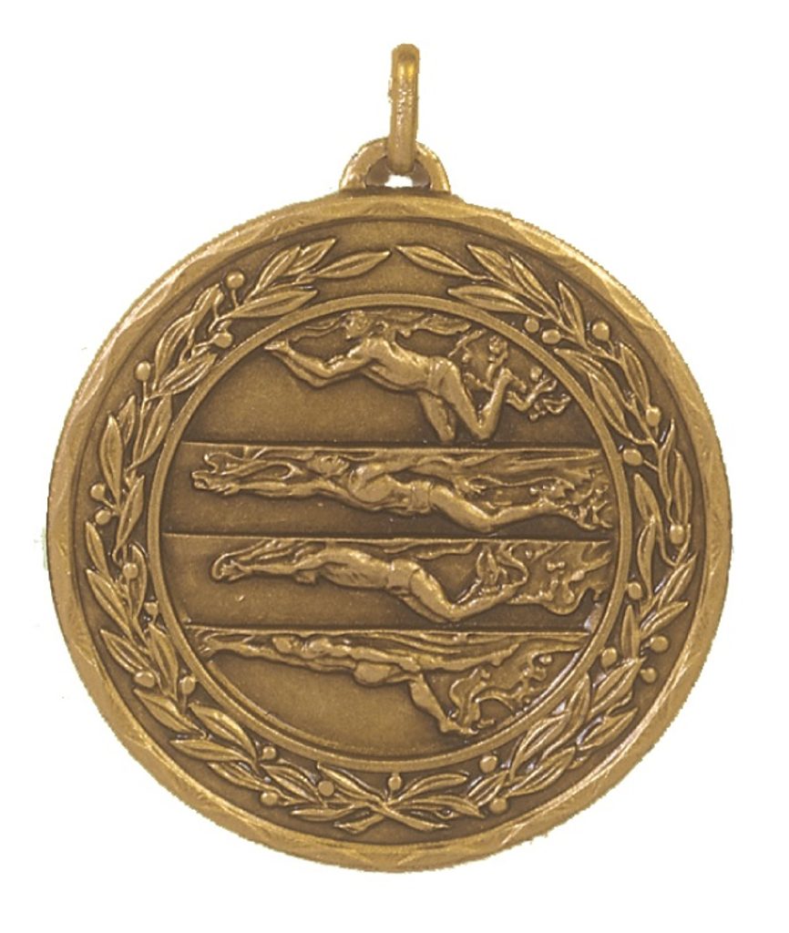 A high quality embossed bronze metal swimming medal displaying a swimmer in front crawl, back crawl, breaststroke and butterfly stroke action within a laurel design. The diameter is 50mm and the thickness is 3mm giving the medal a heavy feel. This medal can be engraved on the reverse and comes complete with a loop to accomadate a ribbon.