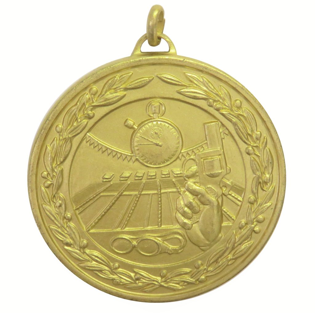 A high quality embossed gold metal swimming medal displaying a stopwatch, starter gun, goggles and swimming pool lanes within a laurel design. The diameter is 50mm and the thickness is 3mm giving the medal a heavy feel. This medal can be engraved on the reverse and comes complete with a loop to accomadate a ribbon.