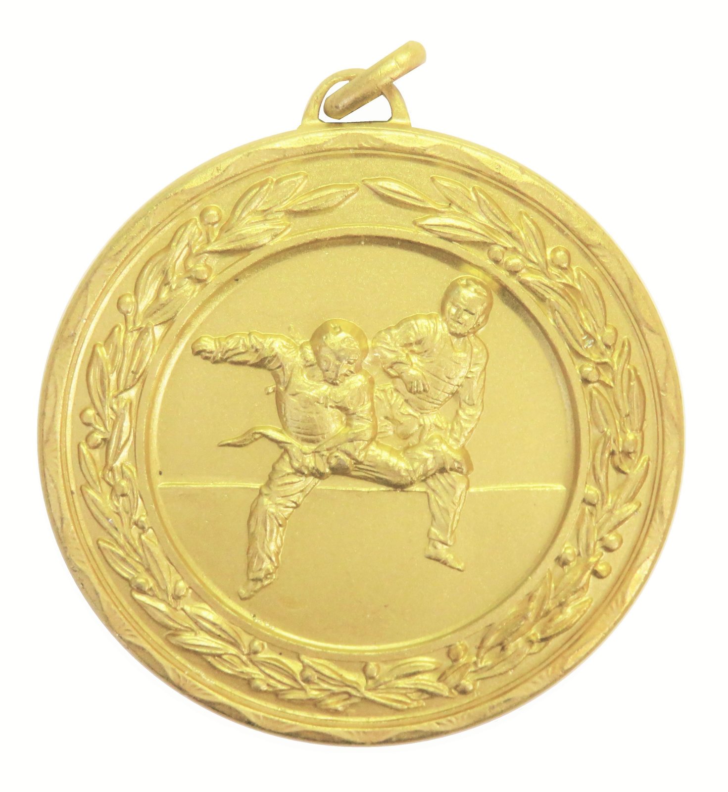 A high quality embossed gold metal taekwondo medal displaying two fighters in competition within a laurel design. The diameter is 50mm and the thickness is 3mm giving the medal a heavy feel. This medal can be engraved on the reverse and comes complete with a loop to accomadate a ribbon.