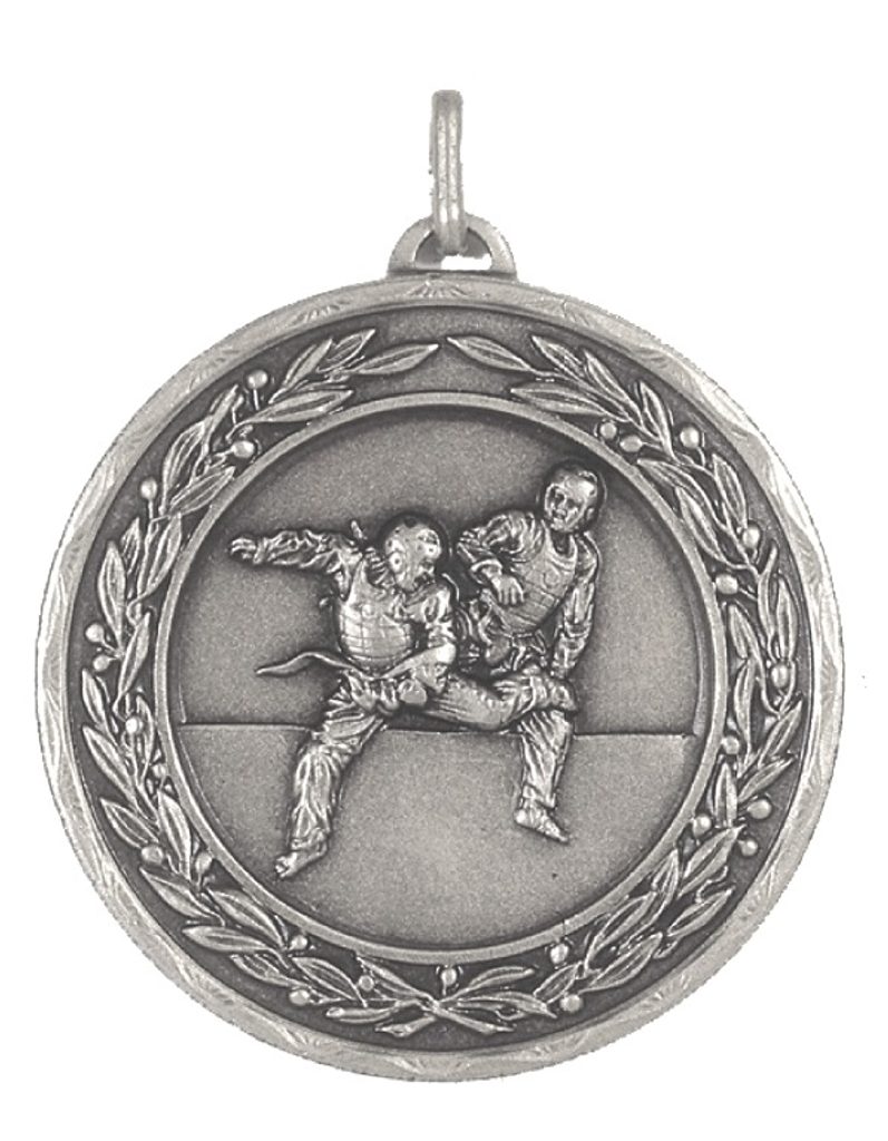 A high quality embossed silver metal taekwondo medal displaying two fighters in competition within a laurel design. The diameter is 50mm and the thickness is 3mm giving the medal a heavy feel. This medal can be engraved on the reverse and comes complete with a loop to accomadate a ribbon.