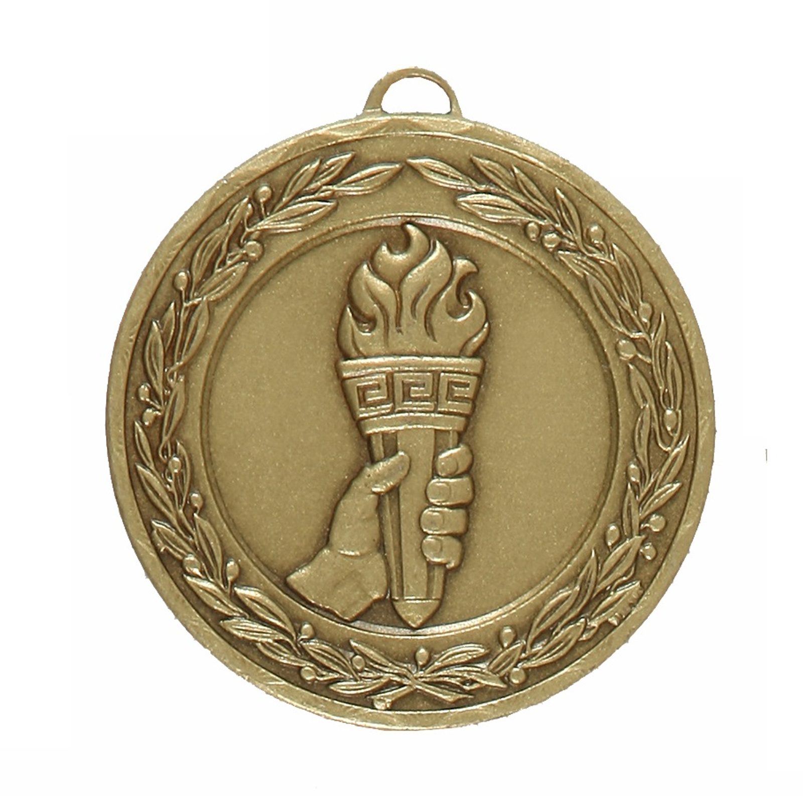 A high quality embossed bronze metal victory torch achievement medal displaying the universal torch image within a laurel design. The diameter is 50mm and the thickness is 3mm giving the medal a heavy feel. This medal can be engraved on the reverse and comes complete with a loop to accommodate a ribbon.