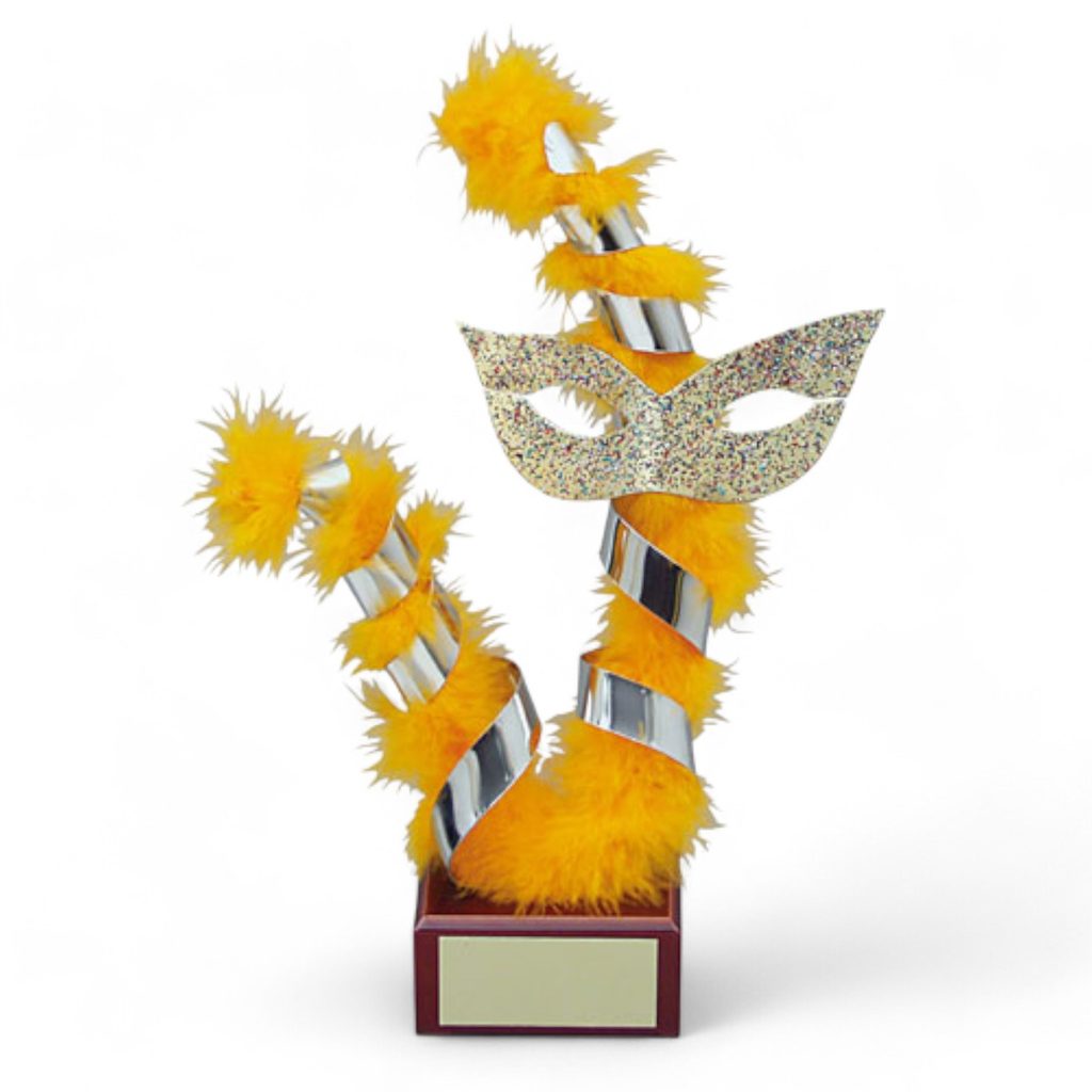 Introducing the vibrant Leon Carnival Trophy, a meticulously handcrafted award that embodies the festive spirit and flair of carnival celebrations. This exclusive trophy features a dazzling masquerade mask adorned with glitter, surrounded by swirling metal spirals wrapped in bright orange feathers. Set atop a polished wooden base, it brings a lively and eye-catching statement to any display.