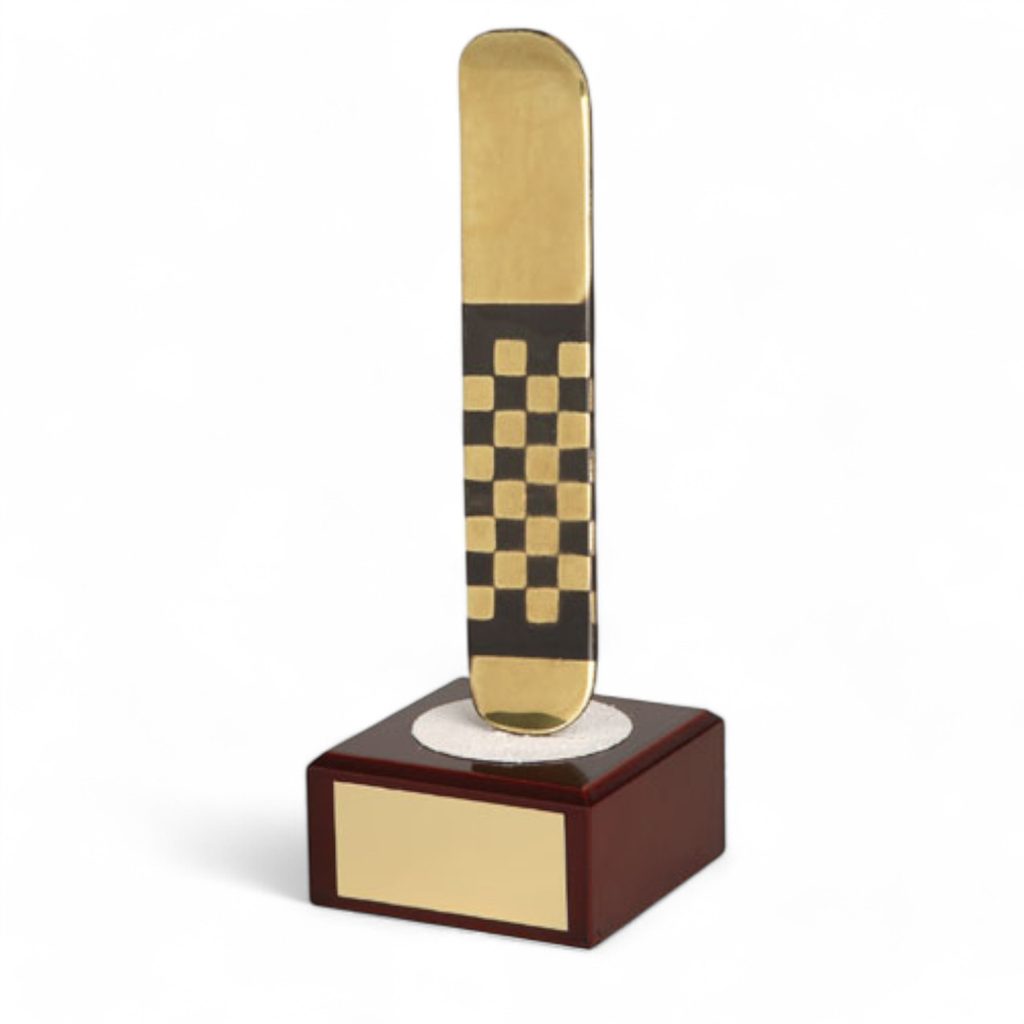 Introducing the distinguished Leon Snowboarding Trophy, a meticulously handcrafted metal award that embodies elegance and the thrill of winter sports. This exclusive trophy features a stylised snowboard with a striking checkered design, symbolising skill and adventure on the slopes. Mounted on a polished wooden base, it makes a bold and refined statement.