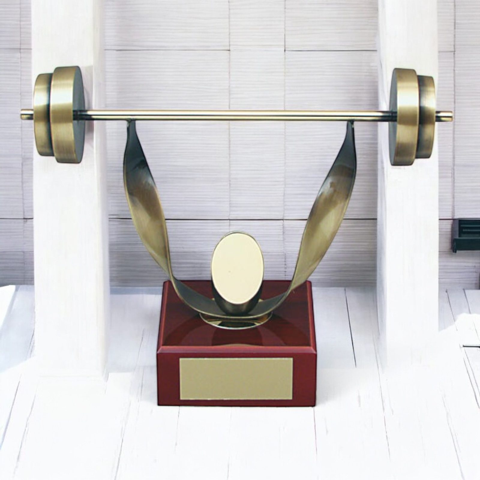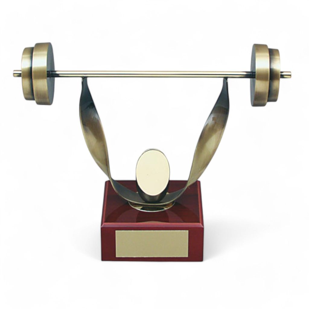 Introducing the distinguished Leon Weightlifting Trophy, a meticulously handcrafted metal award that embodies elegance and strength. This exclusive trophy features a stylised barbell design held by curved metal weightlifter, symbolising power and resilience, all set atop a polished wooden base for a striking visual impact.