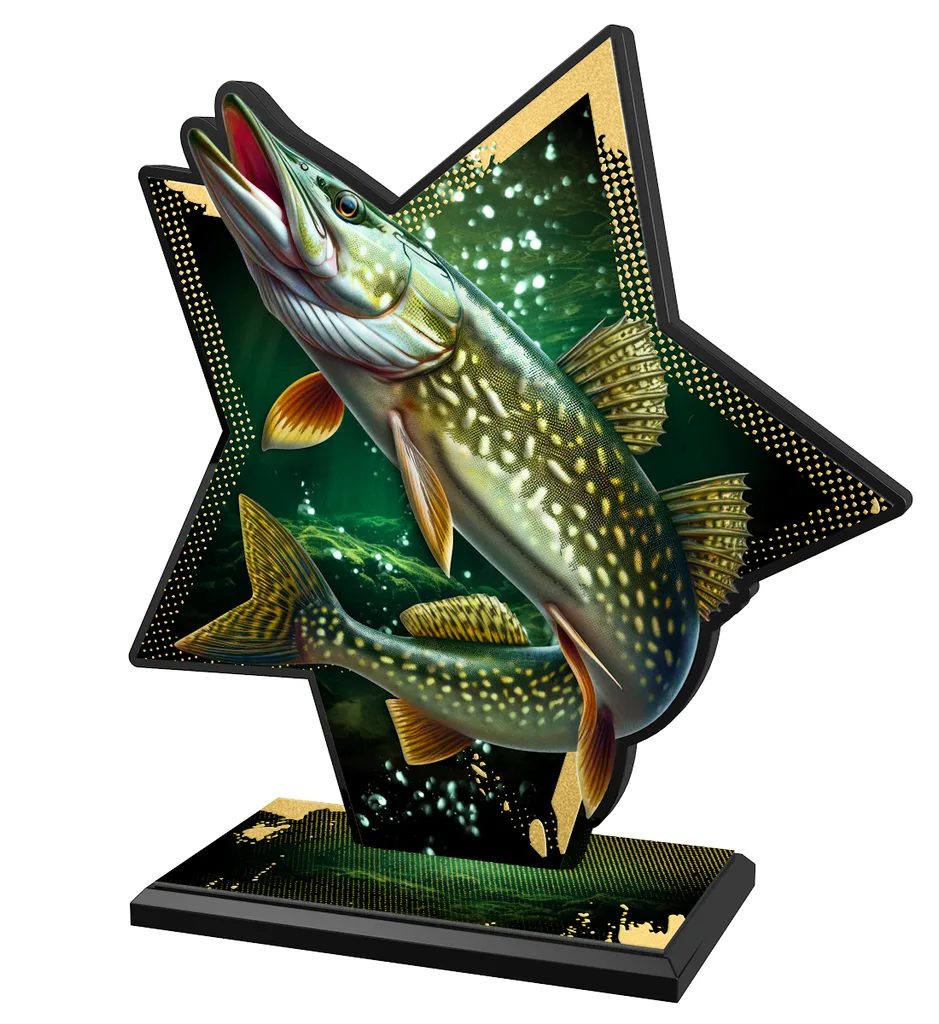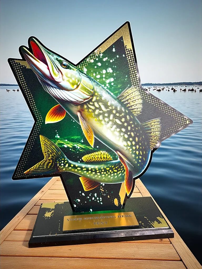A premium modern fishing trophy combining textured printed metal with bold acrylic depth, designed to stand out at fishing competitions, angling events and club presentations.