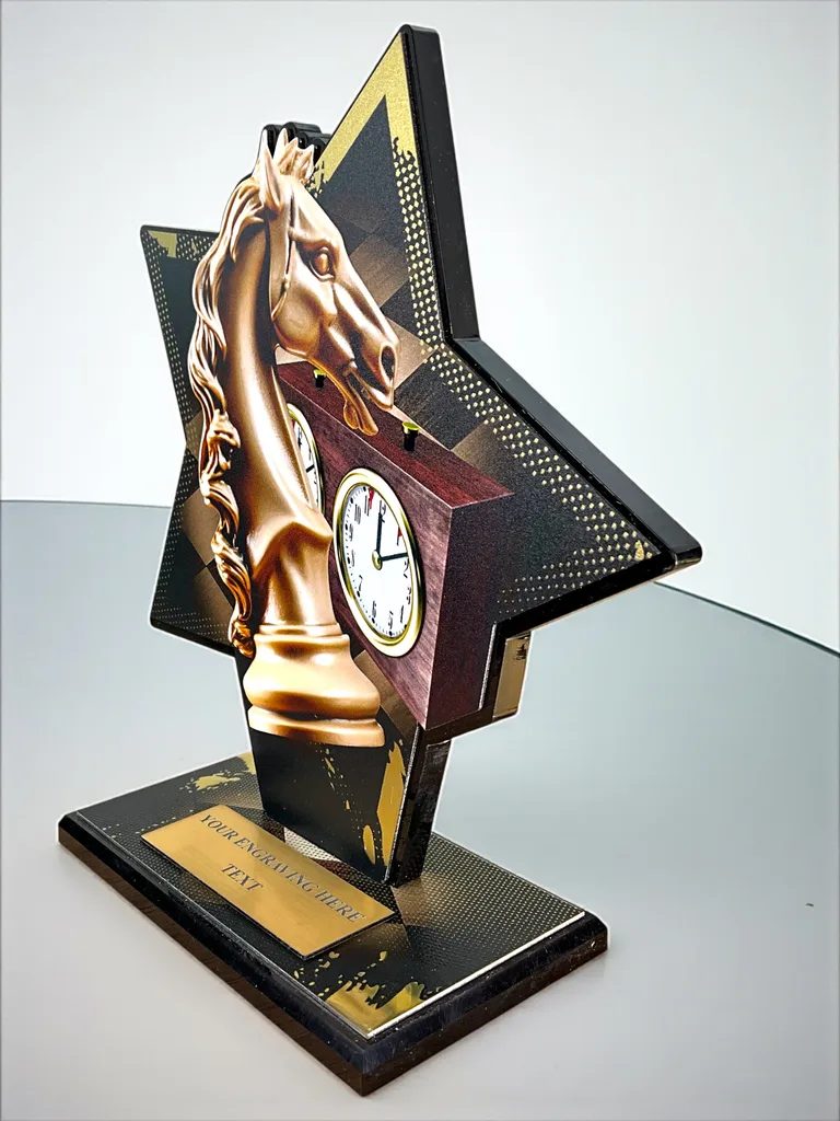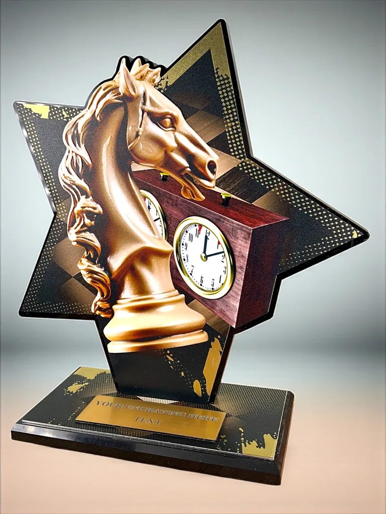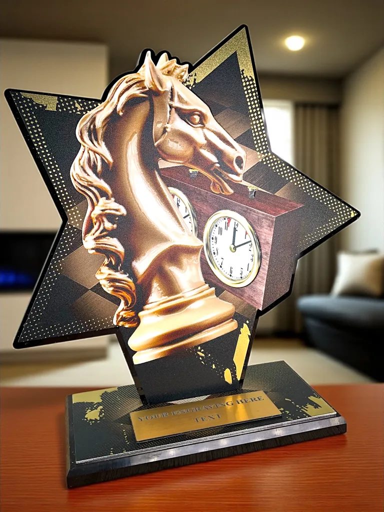 A premium modern chess trophy combining textured printed metal with bold acrylic depth, designed to stand out at chess clubs, tournaments and competitions.