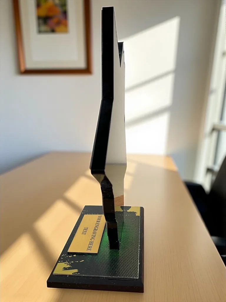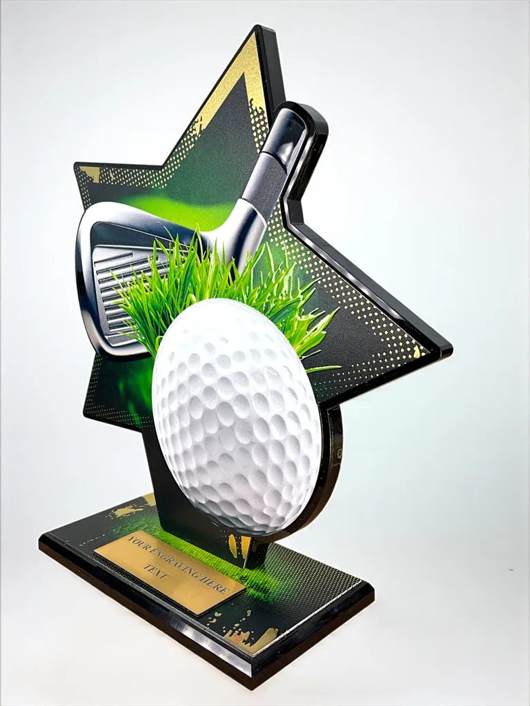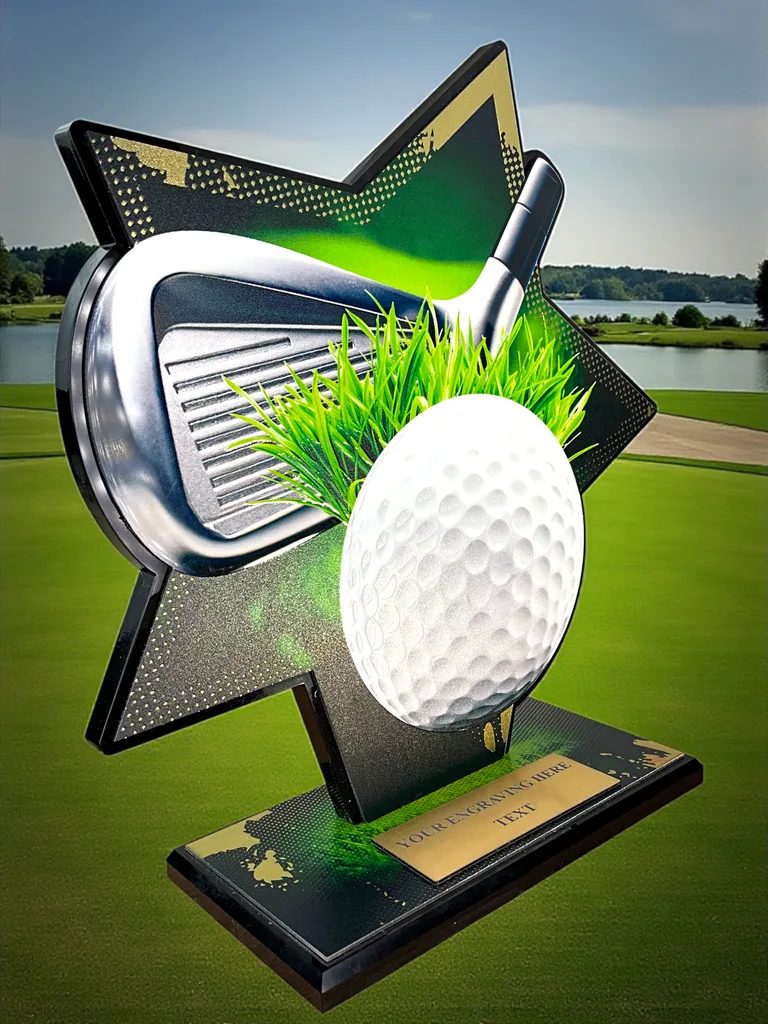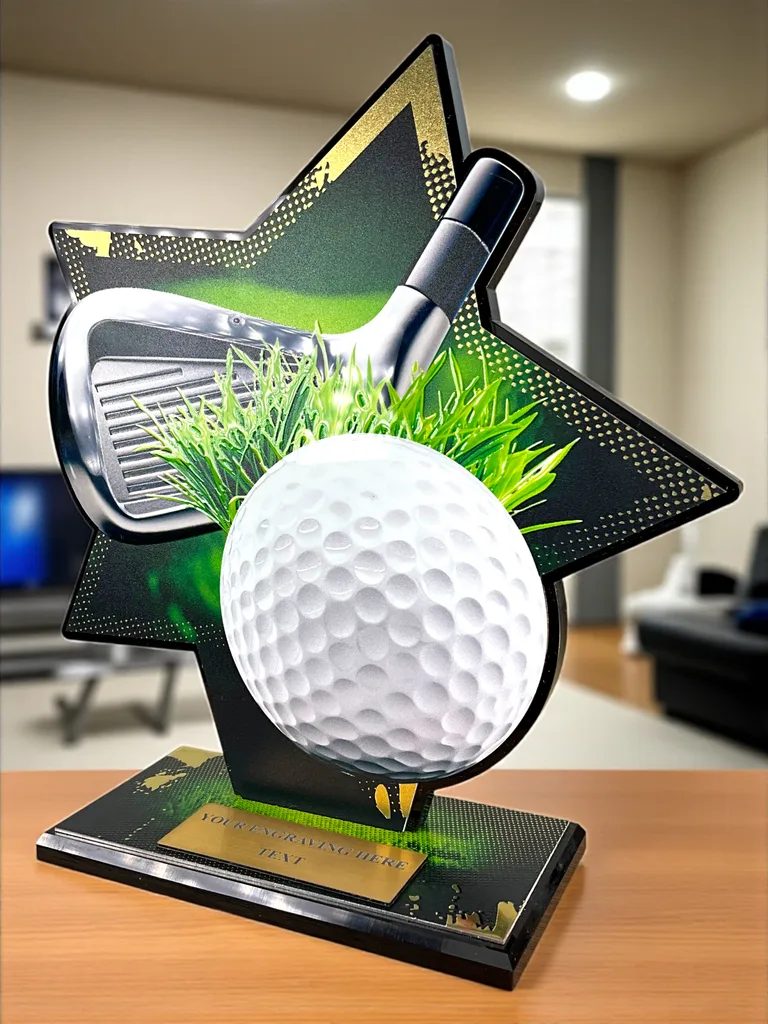 A premium modern golf trophy combining textured printed metal with bold acrylic depth, designed to stand out on any presentation table.