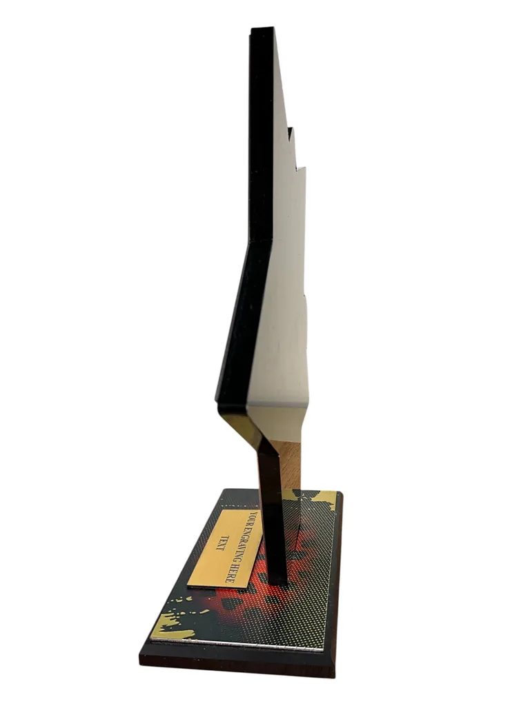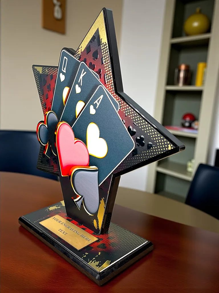 A premium modern poker and card game trophy combining textured printed metal with bold acrylic depth, designed to stand out at poker nights, tournaments and card game events.