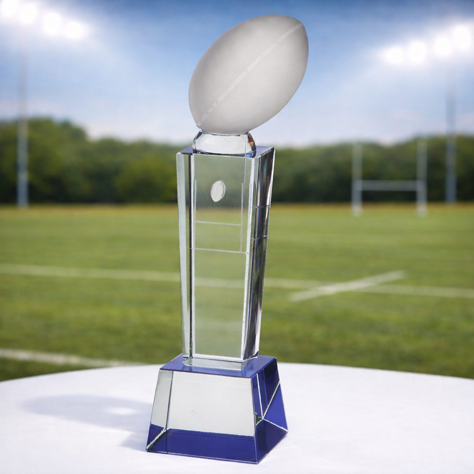 Premium glass rugby trophy – elegant design with a cut glass rugby ball top