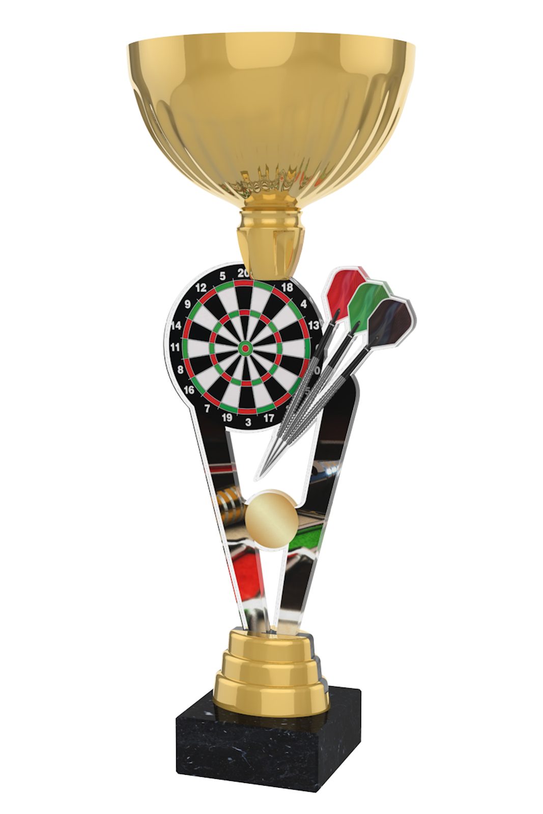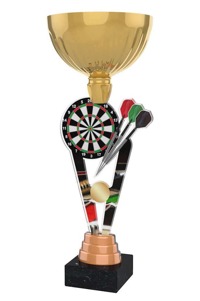 The London Darts Cup Trophy has a centrepiece featuring a double sided full colour print on 6mm thick acrylic. Fixed to a metal bowl, the cup is then mounted onto a black marble base. Please select which colour riser you like from gold, silver or bronze. The riser sits just above the base.