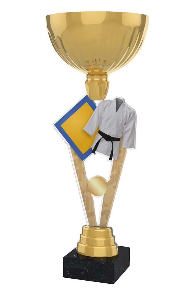 The London Martial Arts Cup Trophy has a centrepiece featuring a double sided full colour print on 6mm thick acrylic. Fixed to a metal bowl, the cup is then mounted onto a black marble base. Please select which colour riser you like from gold, silver or bronze. The riser sits just above the base.