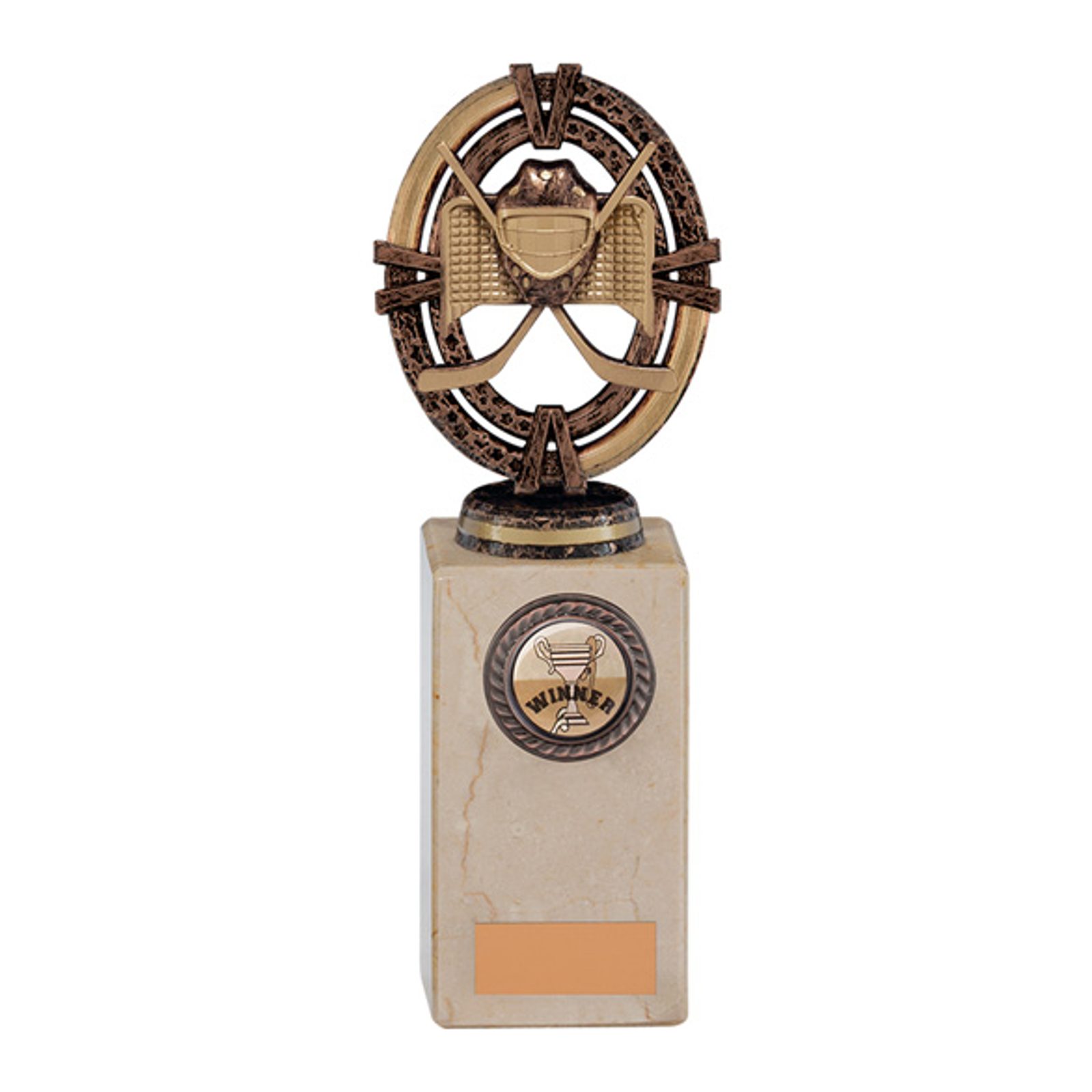 The Maverick Legend Ice Hockey Trophy is a stunning 3D design made from high quality plastic. Glazed in a stunning antique bronze and gold finish, and mounted on a standout white marble base.