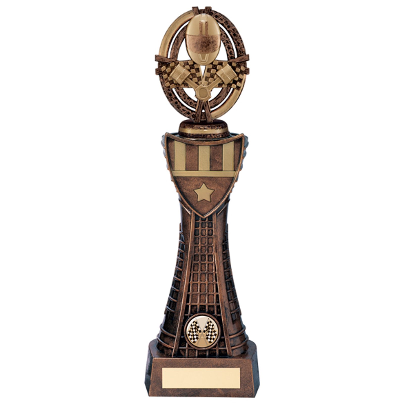 The Maverick Motorsports Trophy is a stunning 3D design made from high quality heavyweight plastic. Glazed in a stunning antique bronze and gold finish.