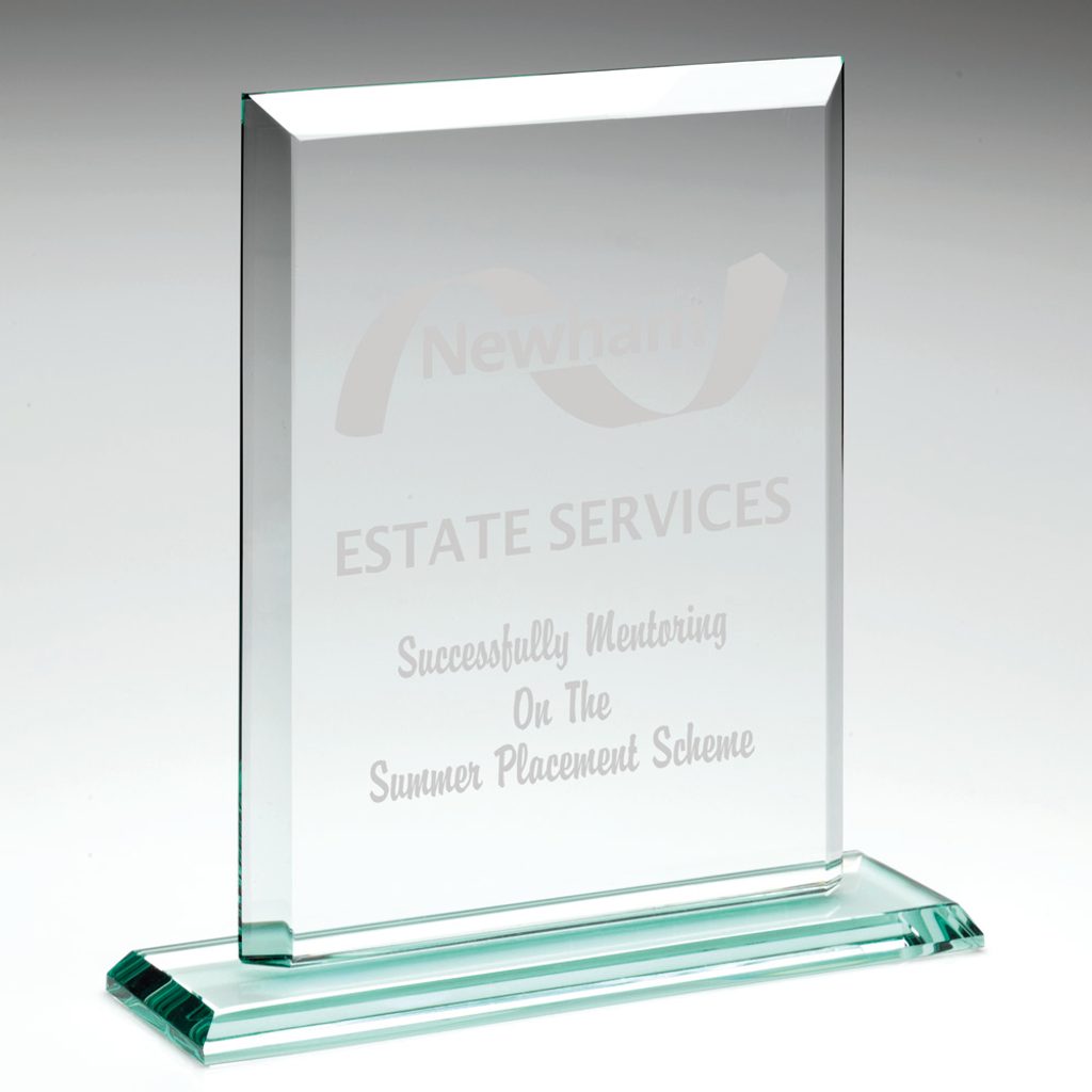 The Mensa Jade Glass Award is an exceptional trophy made of high-quality, 10mm thick, beveled crystal, and mounted on a sturdy glass base. It comes with a complimentary silk-lined presentation box, adding to its elegance and sophistication.