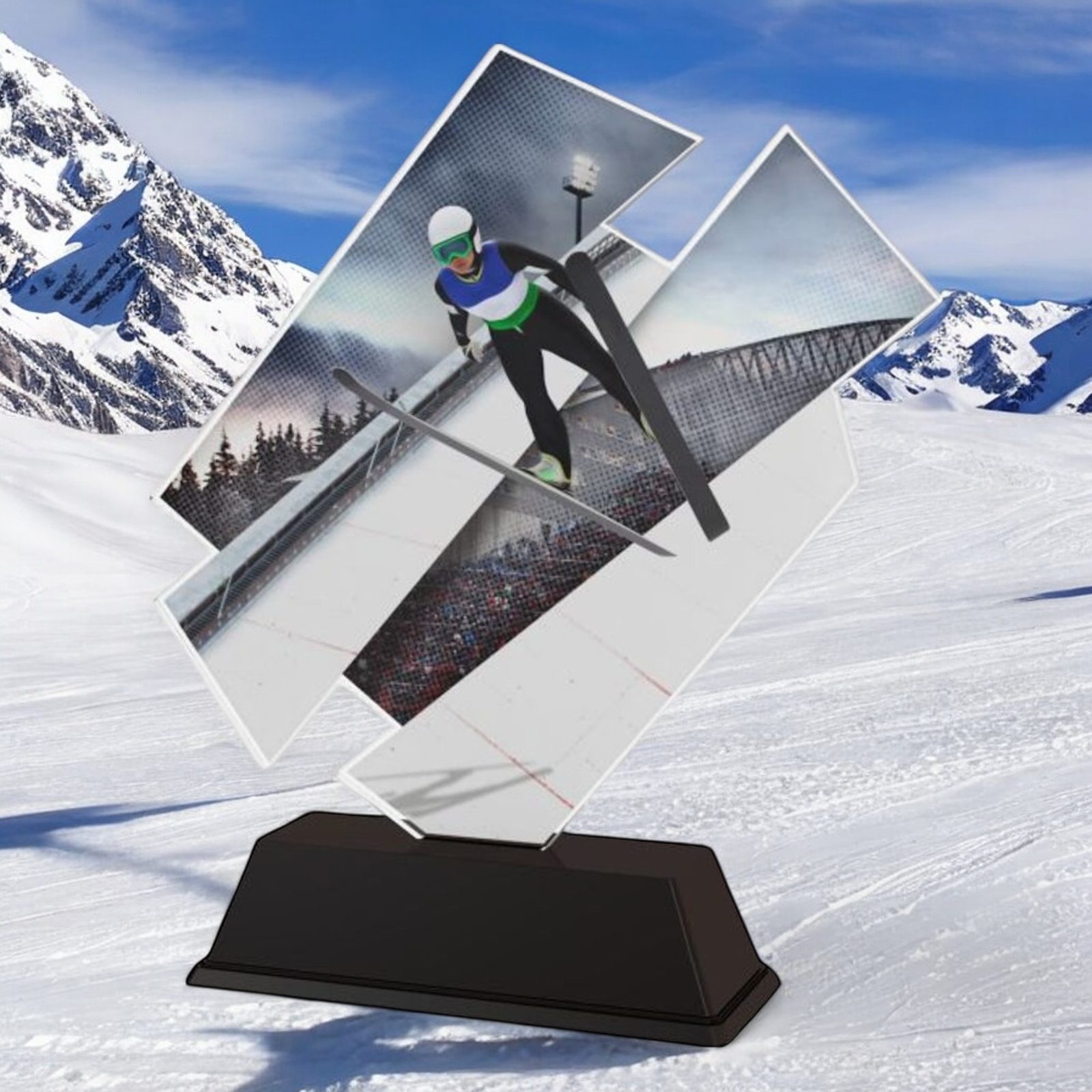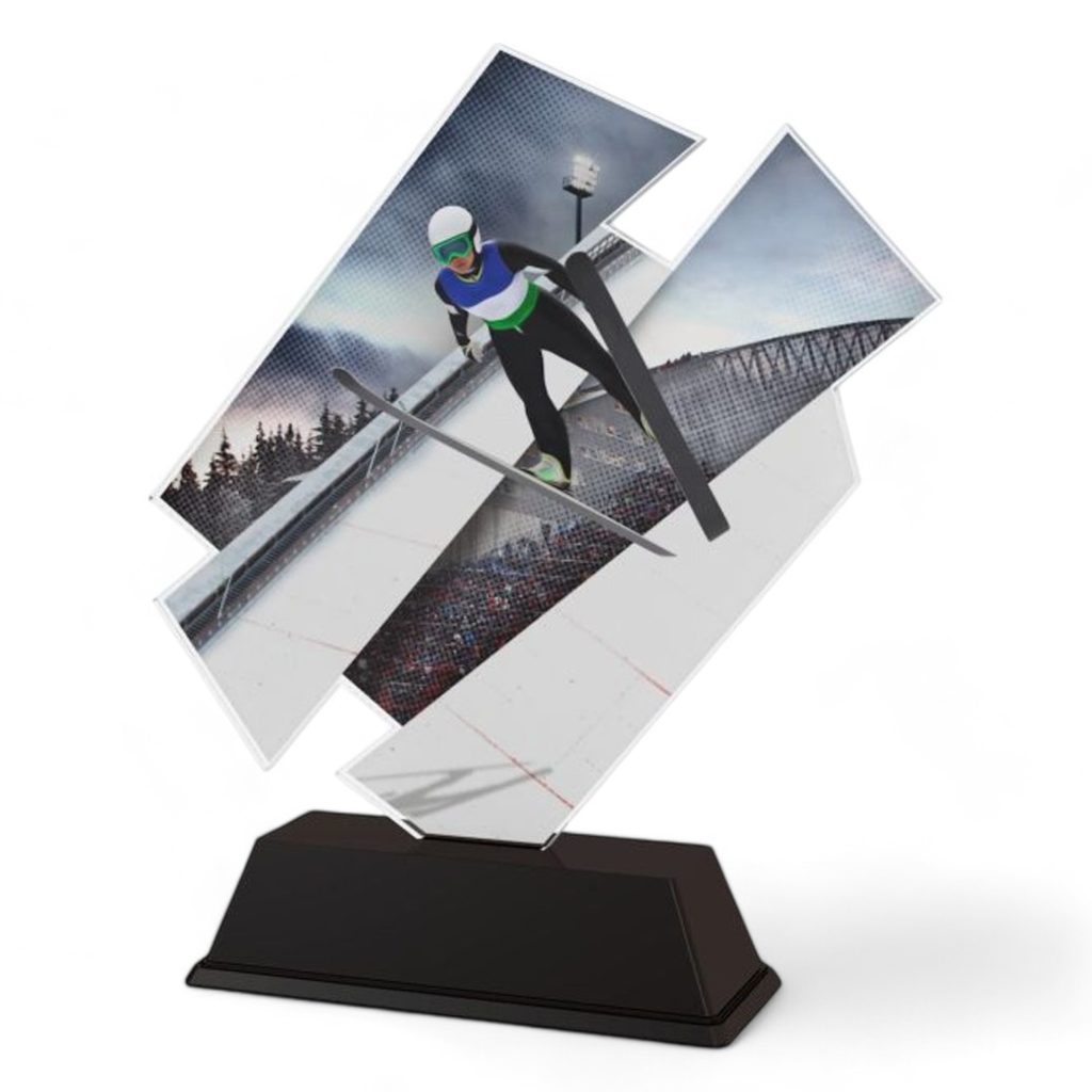 The Meribel Ski Slalom Trophy is a contemporary artistic award with a unique design. Cut to shape this trophy comes to life with a high quality full colour print on the reverse side of the 4mm thick acrylic mounted on a black PVC base.