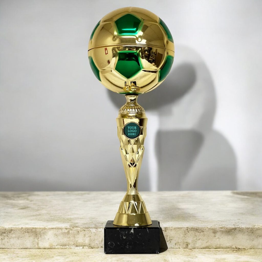 Metal football topper – reflective gold finish with green panel detail