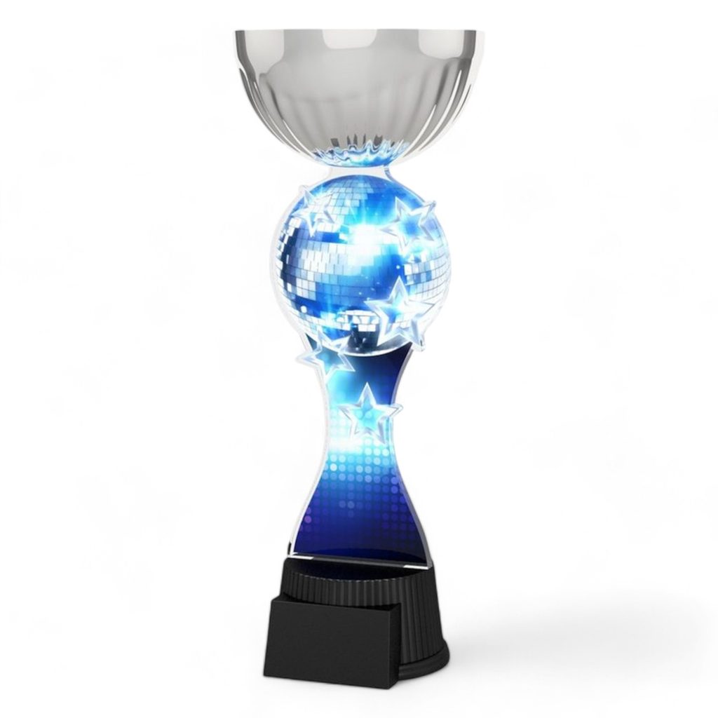 The Montreal Glitterball Dance Silver Cup Trophy will be the centerpiece in any presentation. This trophy features a high quality full colour print on the reverse side of 6mm acrylic, with a silver metal cup, all mounted on a circular and weighted black PVC base.
