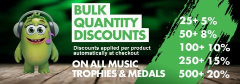 Our Music trophies are expertly crafted in our very own factory from premium materials. Always evolving with new designs every six weeks, these awards are designed to honour musical talent, creativity, and dedication. Whether it's for school concerts, music exams, band competitions or solo performances, every trophy includes free engraving, making each one a special memento of achievement and passion for music.