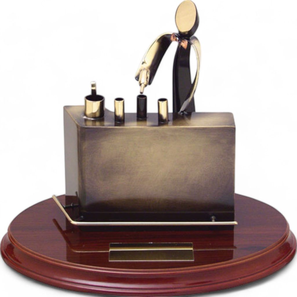 Introducing the elegant Navas Bartender Trophy, a finely crafted metal award celebrating the artistry of mixology. This unique trophy features an abstract bartender figure in action, meticulously crafted to capture the spirit and skill of bartending. Set on a beautifully polished wooden base, it brings sophistication and charm to any setting.