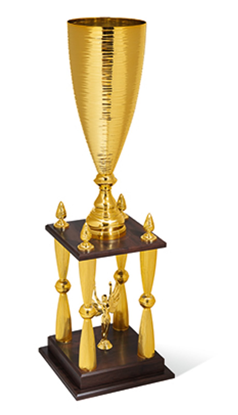 The Orco Four Column Gold Trophy Cup is a stunning award. Standing from a massive 640mm. This trophy is designed and constructed in Italy comprising of plastic columns, figures and a metal cup that sits on top. This is all fixed to two wooden platforms.