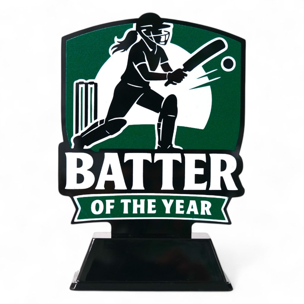 Celebrate outstanding women’s batting performances with the Pavilion Batter of the Year Trophy. Part of Trophy Monster’s exclusive Pavilion Collection, this specialist award is made from 4mm printed black acrylic with bold black, green and white branding. Available in six sizes and supplied with a FREE engraved plate, it’s a unique trophy designed in-house and available only from Trophy Monster.