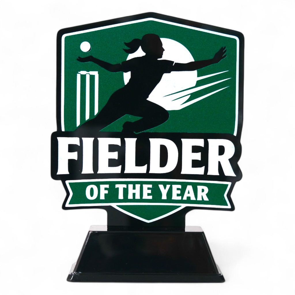 Celebrate outstanding women’s cricket fielding performances with the Pavilion Women’s Fielder of the Year Trophy. Part of Trophy Monster’s exclusive Pavilion Collection, this specialist award is crafted from 4mm printed black acrylic with bold black, green and white branding. Available in six sizes and supplied with a FREE engraved plate, it’s a unique trophy designed in-house and found only at Trophy Monster.