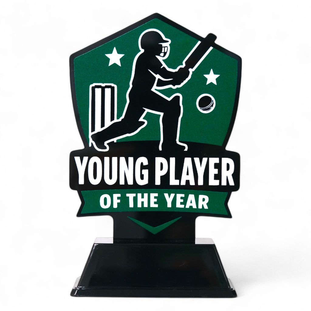 Celebrate rising cricket talent with the Pavilion Young Player of the Year Trophy. Part of Trophy Monster’s exclusive Pavilion Collection, this award is crafted from 4mm printed black acrylic with bold black, green and white branding. Offered in six sizes and supplied with a FREE engraved plate, it’s a sleek and modern design created in-house and available only from Trophy Monster.