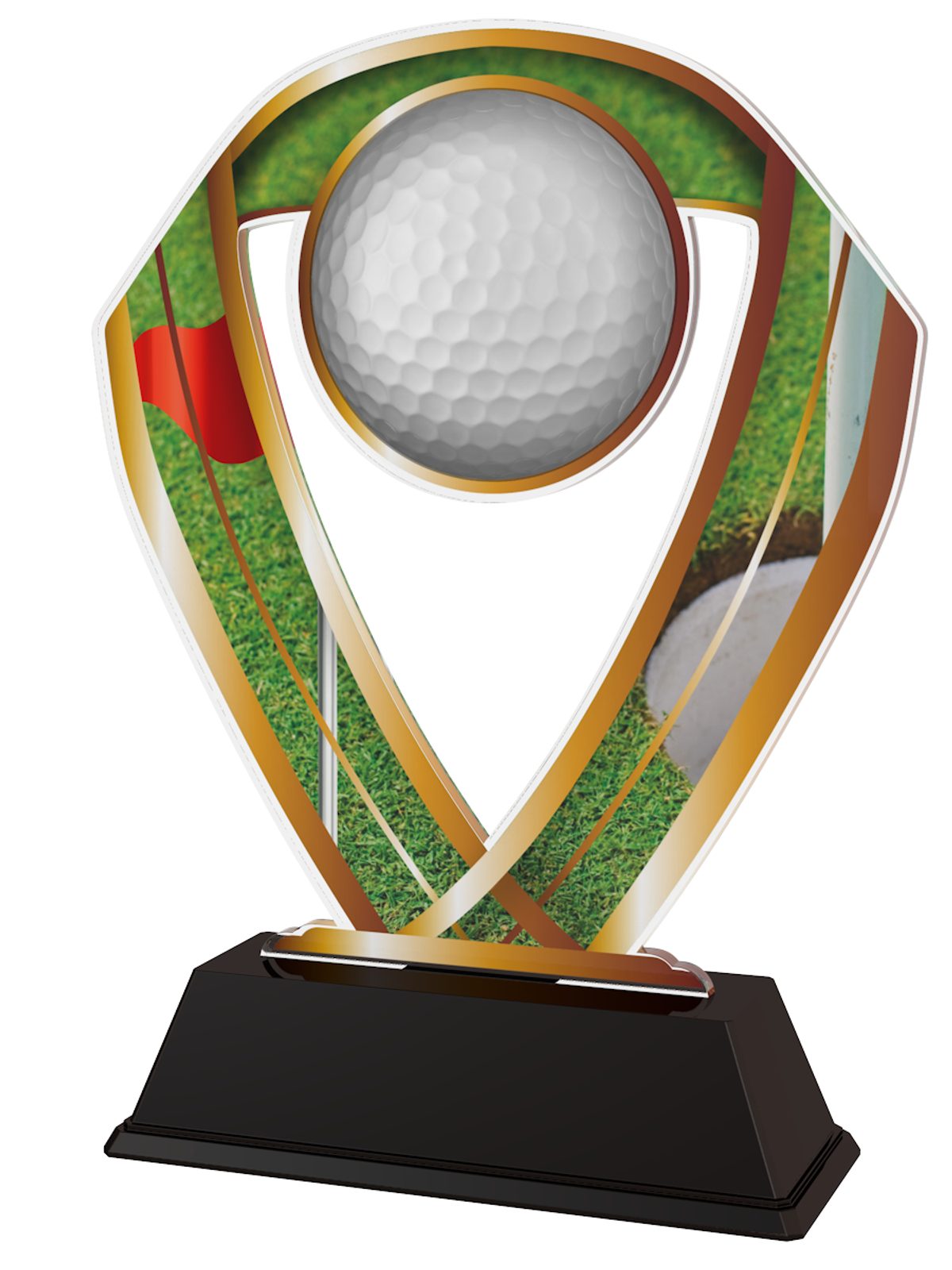 The Penza Golf Trophy is a modern style award. Please select the outer trim colour you would like from gold, silver or bronze. Cut to shape this trophy has a high quality full colour print on the reverse side of the 4mm thick acrylic mounted on a black PVC base.
