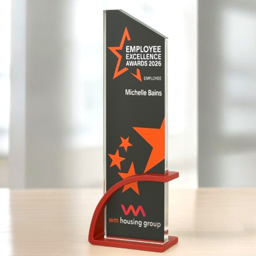 The Prismia Full Colour UV Printed Glass Award delivers modern impact with premium clarity and bold colour. Made from 12mm thick glass, this vertical plaque is mounted in a vibrant red metal stand and features high-resolution UV printing – perfect for logos, text, or full-colour images. Stands 255mm tall and is supplied in a presentation box.