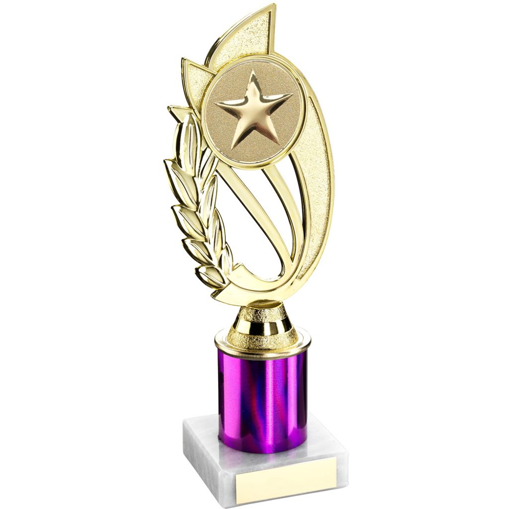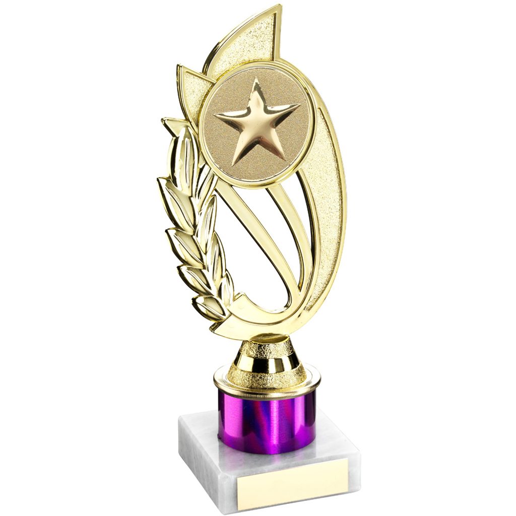 The Purple Star Logo Insert Trophy is a classic plastic award mounted on a white marble base.