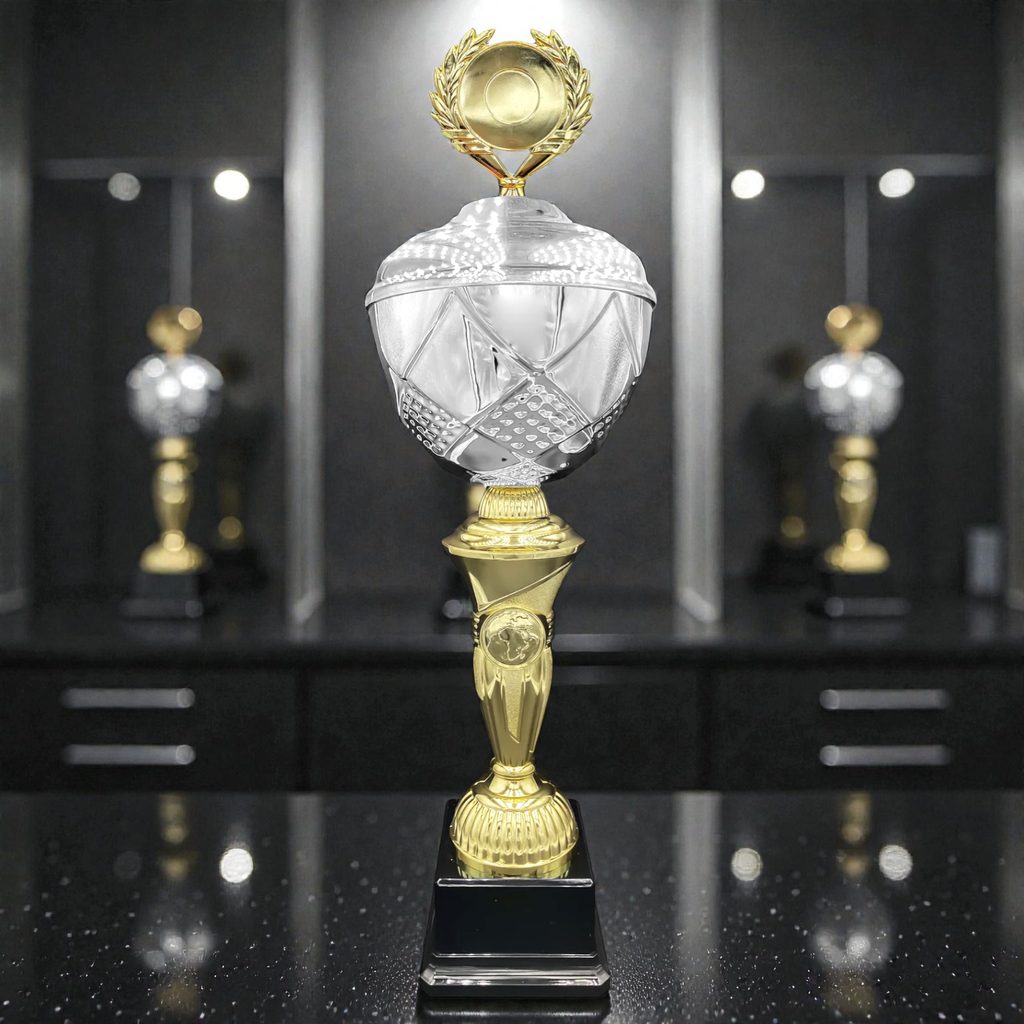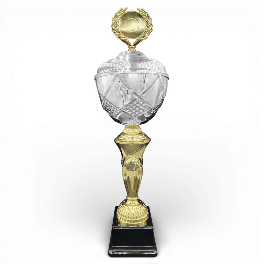The Reginald Silver & Gold Logo Cup is a striking modern award combining a bold gold metal bowl with elegant silver detailing. The contrast between finishes gives this trophy strong visual impact, making it ideal for competitions, presentations and club awards.