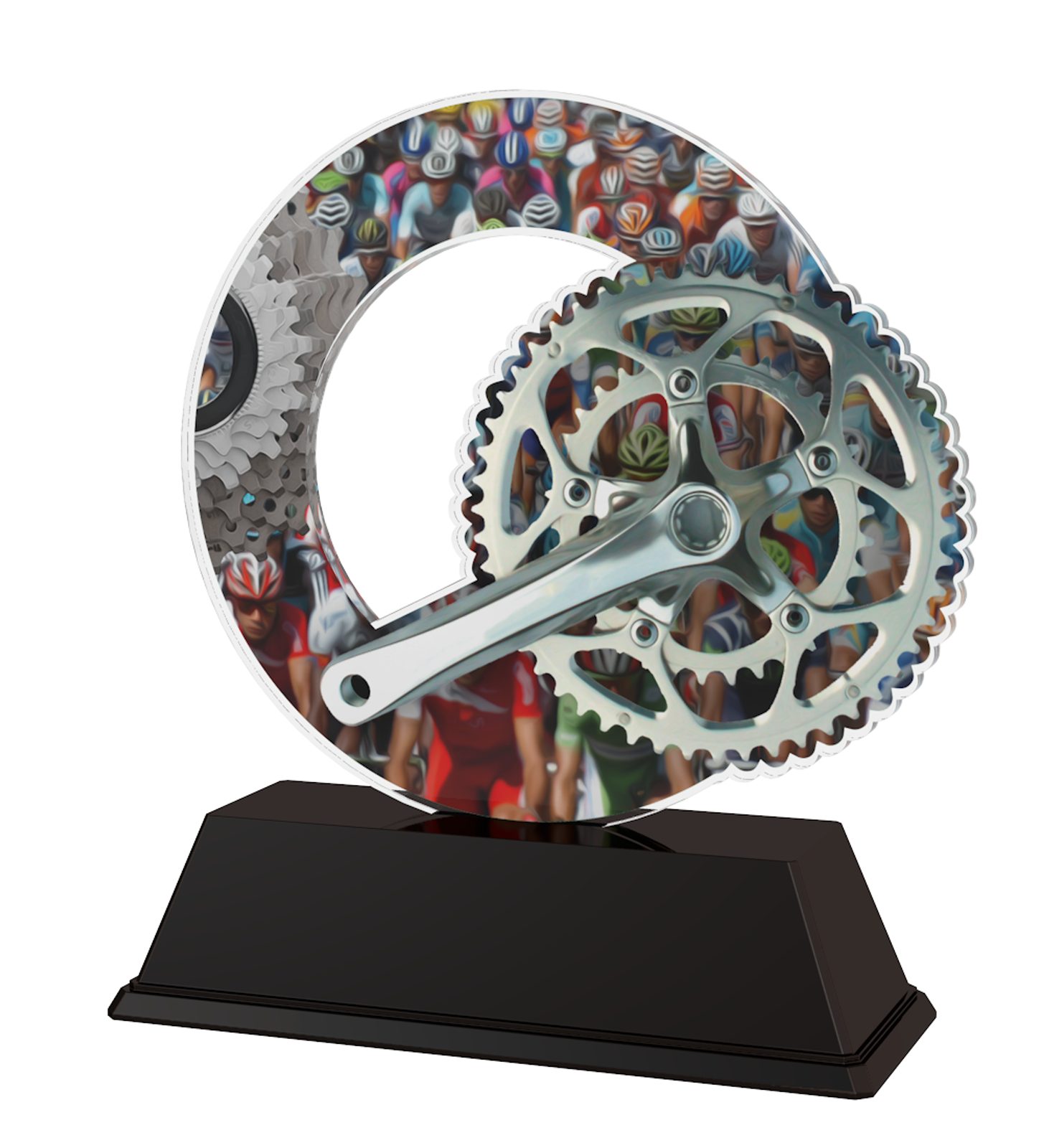 The Rio Cycling Trophy is a vibrant low cost award with cutting edge design. Cut out to shape this trophy features