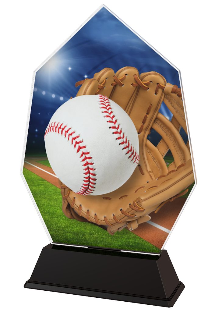 The Roma Baseball Catch Trophy is a striking and impressive award. Expertly cut to shape, this trophy comes to life with a high quality full colour double sided print on 4mm thick acrylic mounted on a black PVC base.