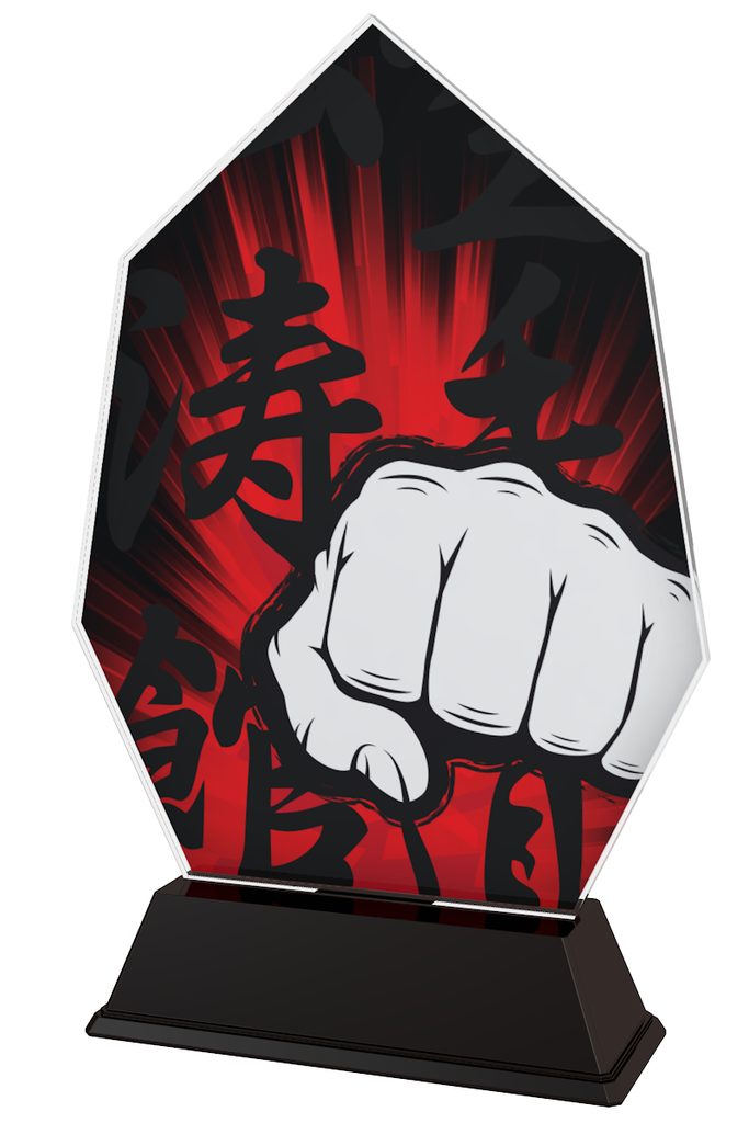 The Roma Martial Arts Fist Trophy is a striking and impressive award. Expertly cut to shape, this trophy comes to life with a high quality full colour double sided print on 4mm thick acrylic mounted on a black PVC base.