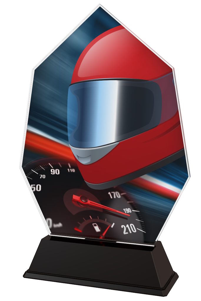 The Roma Motorsports Trophy is a striking and impressive award. Expertly cut to shape, this trophy comes to life with a high quality full colour double sided print on 4mm thick acrylic mounted on a black PVC base.