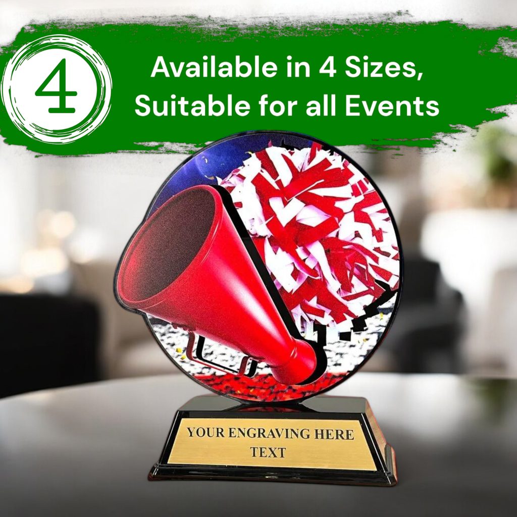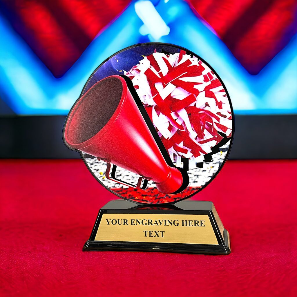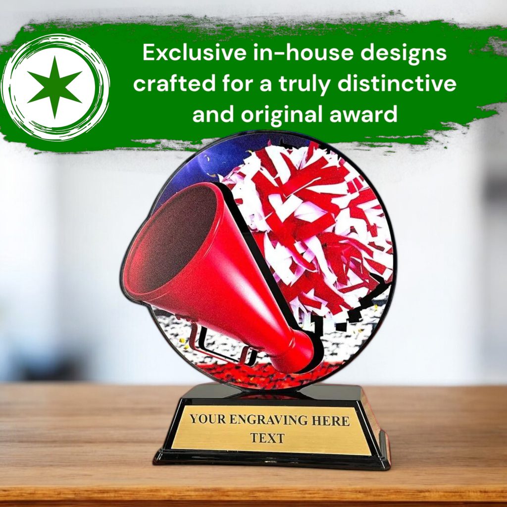 The Roswell Cheerleader Trophy is a contemporary award designed for vibrant, full-surface printing.