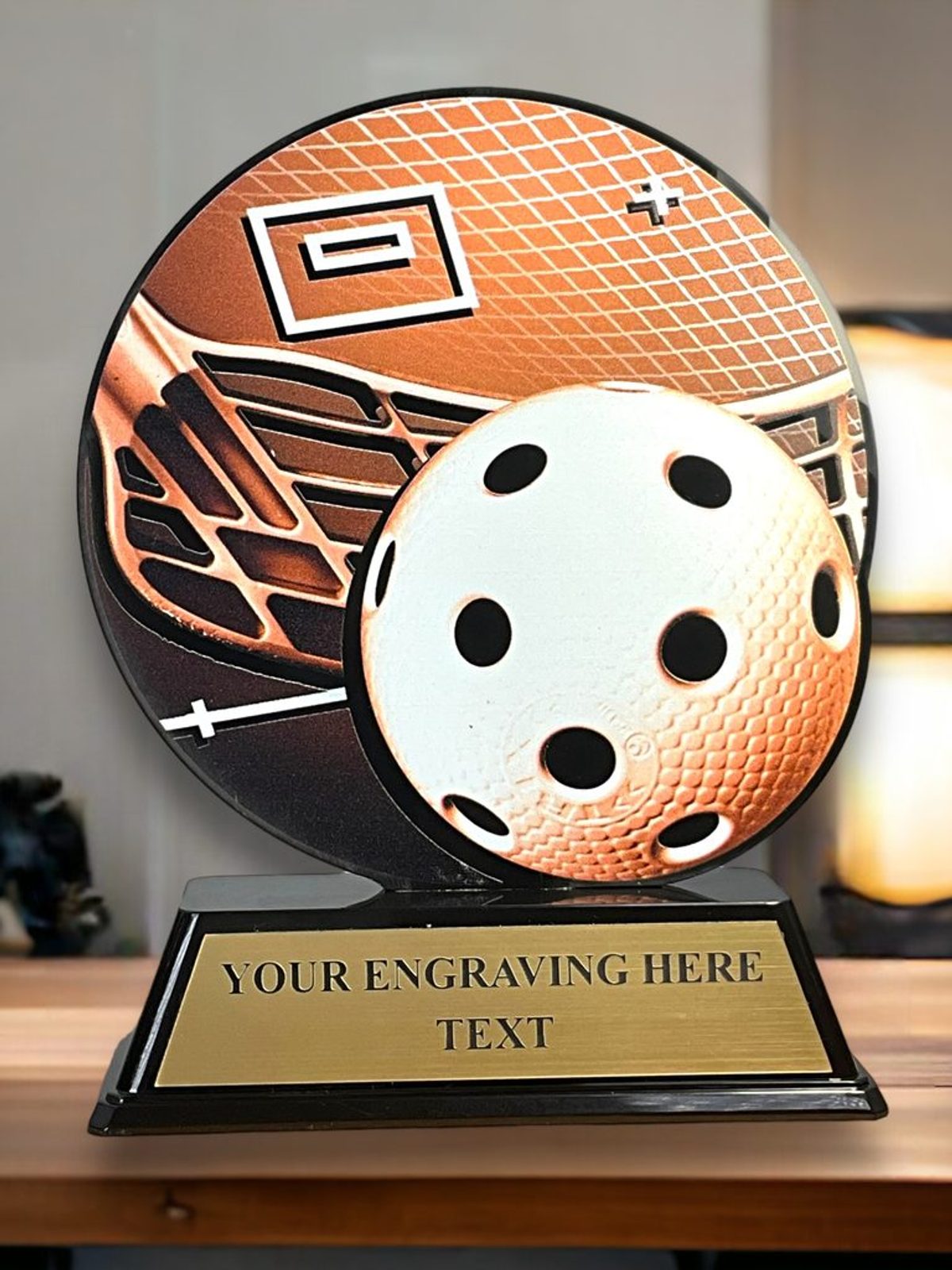 The Roswell Floorball Trophy is a contemporary award designed for vibrant, full-surface printing.