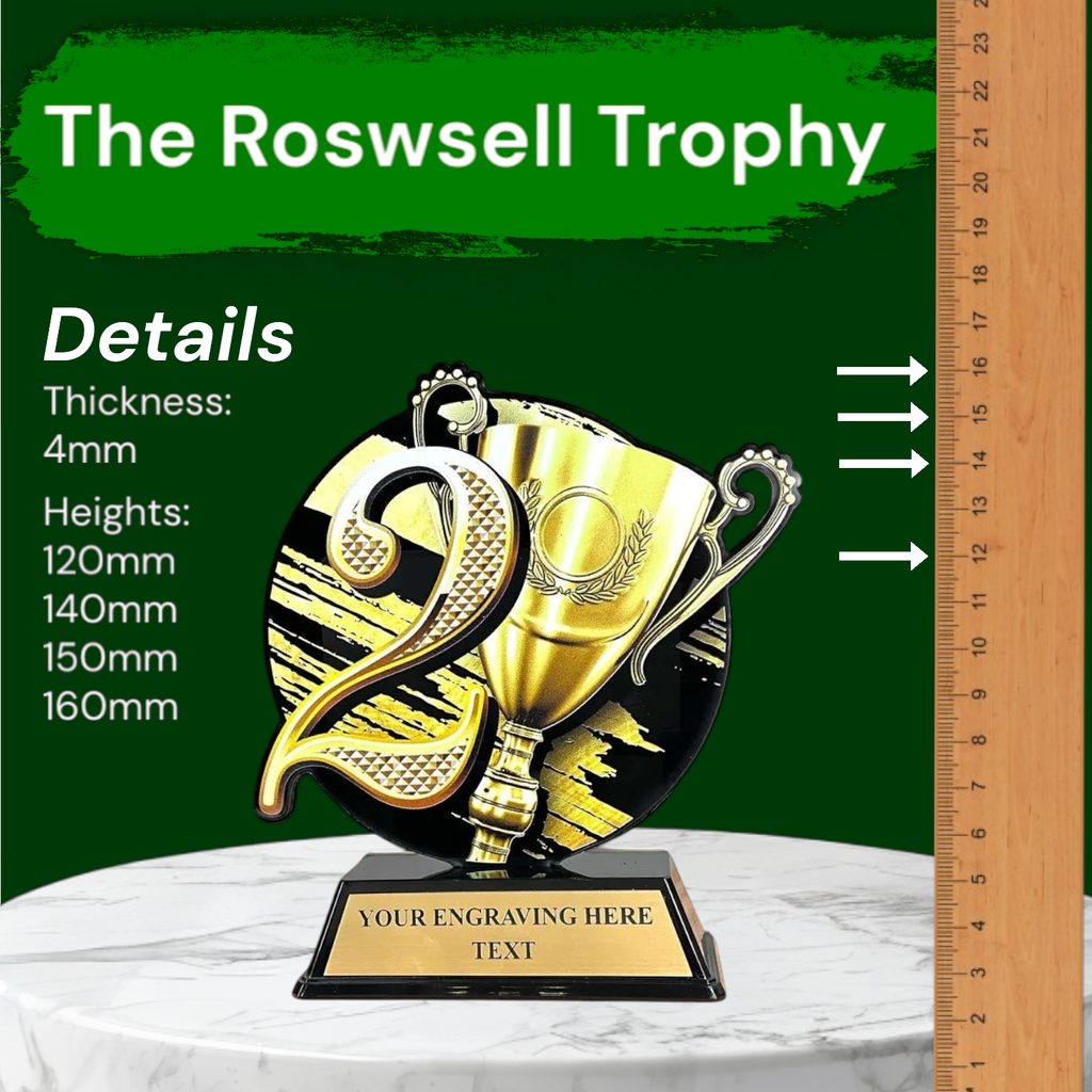 The Roswell Number 2 Trophy is a contemporary award designed for vibrant, full-surface printing.