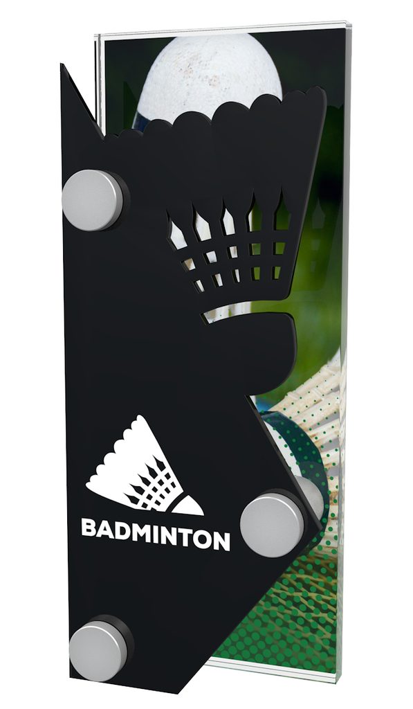 The Salzburg Badminton Trophy is made from two pieces of acrylic. These are connected by using three steel screw fittings. The back piece is a 10mm thick piece of high quality printed acrylic, and the front piece is laser cut black acrylic.